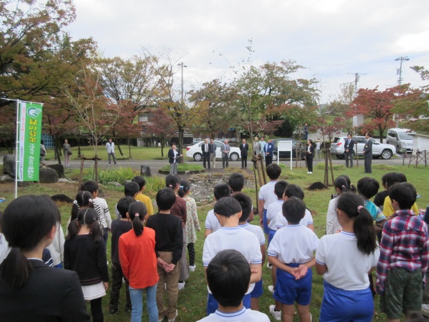 児童を代表し、山本怜生児童会長がお礼のあいさつを行い、各学年の児童代表らが、池の周りにコナラ3本を記念植樹しました。
