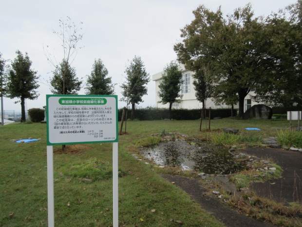 児童が緑化の重要性や自然の大切さを学び、みんなが集い語らう場となるよう、ホタルなどが生息するビオトープ(ひょうたん池)の整備に助成したものです。