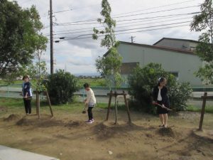 完成式典では、金瀬志津校長の式辞の後、野村光蔵(公社)とやま緑化推進機構専務理事の事業説明、門島貴子㈱ローソン新湊津端江店長の挨拶が行われ、児童代表の泉田釉希乃さんと門島店長、竹内礼子PTA会長の3名が、カシの木3本を記念植樹しました。