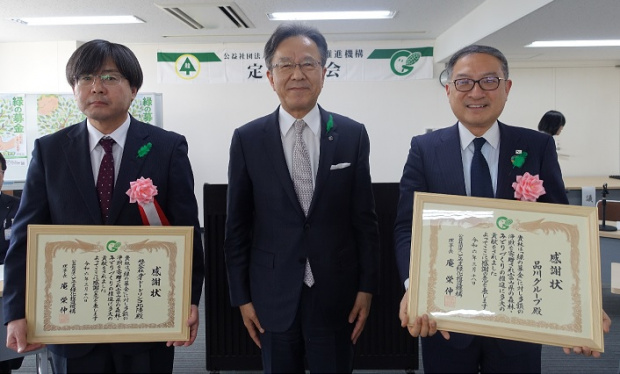 とやま緑化推進機構の「令和6年度定時総会」の開催に先立ち、庵栄伸理事長から「緑の募金」へ高額の寄付をされた企業2社に感謝状をお渡ししました。
