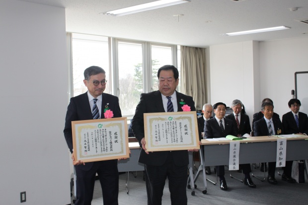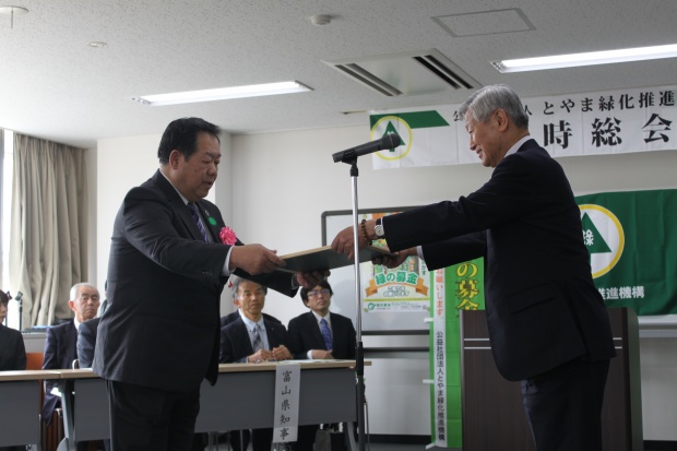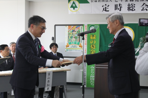 (公社)とやま緑化推進機構の「令和2年度定時総会」の開催に先立ち、「緑の募金」へ高額の寄付をされた企業2社に、当機構の髙木理事長が感謝状をお渡ししました。