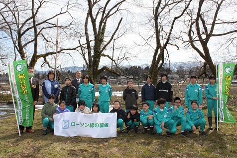 3 出席者 ㈱ローソン南砺福光店長 門田典子、(公社)とやま緑化推進機構専務理事 石田和人、教職員ら約30名