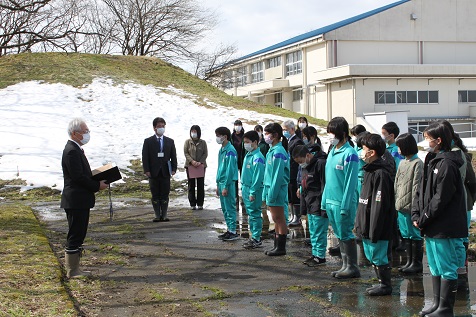 完成式典では、高田篤志教頭の司会で、犀川敏朗校長のあいさつ、石田和人とやま緑化推進機構専務理事の事業説明、門田典子ローソン南砺福光店長のあいさつがありました。