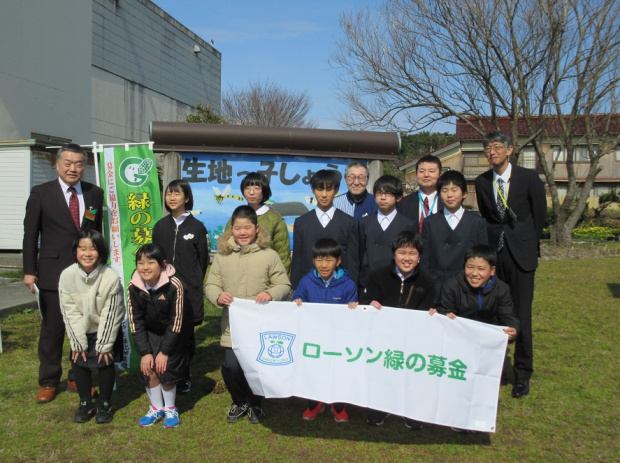3 出席者 ローソン黒部古御堂店オーナー三由孝博、㈱ローソン佐藤圭太、坂元敏之、(公社)とやま緑化推進機構専務理事 石田和人、教職員ら約20名