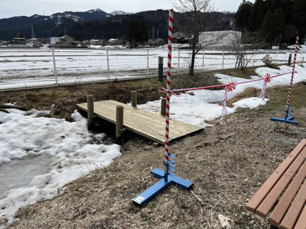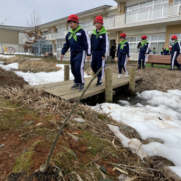 宇奈月小学校の校庭には、子供たちが生きものに触れあうための「ビオトープ」がありましたが、小川を渡る橋が壊れたり、藤棚が老朽化し危険な状況になって子供たちが近づけなくなっていたため、藤棚を撤去し、新しい橋を架け直しました。また、小川を渡った向こうにはミカンの木が植えられました。