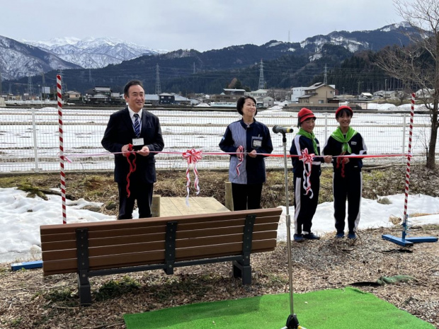 この日は、新しく架け替えられた橋の前で、宇奈月花とみどりの少年団でもある同校児童の参加のもと、齊木学校長のあいさつ、とやま緑化推進機構からの事業説明、ローソン宇奈月温泉店の高木綾子店長の祝辞の後、児童代表からお礼の言葉をいただき、テープカット、橋の渡り初めが行われました。