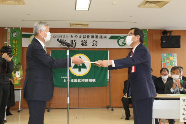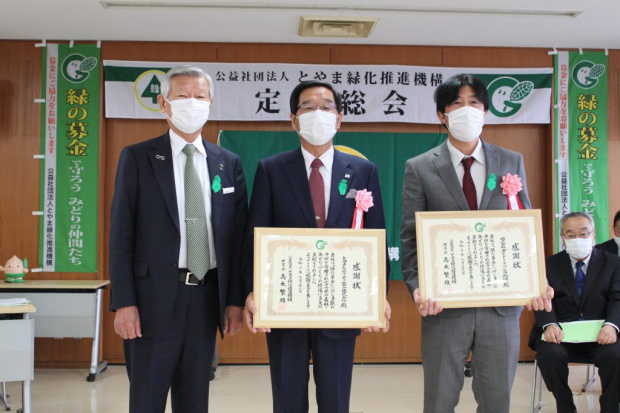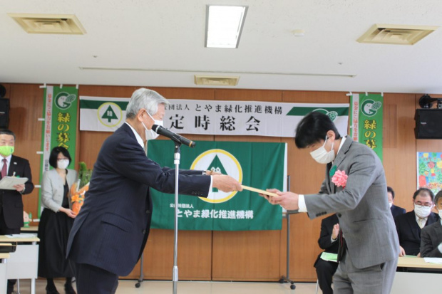(公社)とやま緑化推進機構の「令和3年度定時総会」の開催に先立ち、「緑の募金」へ高額の寄付をされた企業2社に、当機構の髙木理事長が感謝状をお渡ししました。