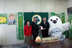 贈呈式には、同社マスコットの「ライペット」君も花を添えました。