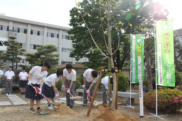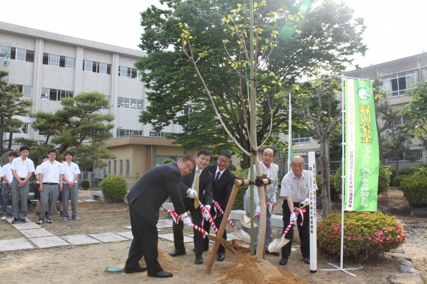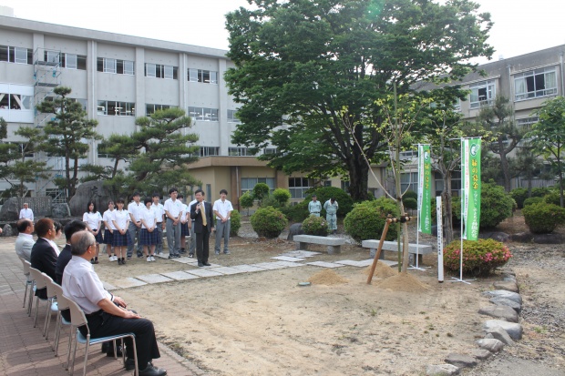 式では、水井修校長の挨拶、伊東尚志とやま緑化推進機構副理事長の祝辞、山崎宗良同窓会長の挨拶の後、生徒も加わり植樹が行われました。
