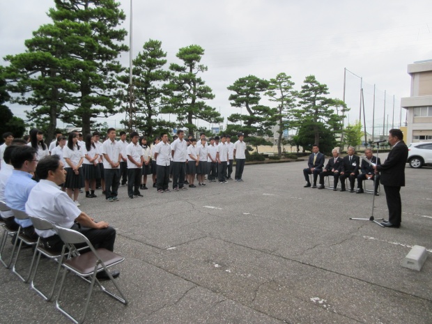 式では、佐野友昭校長の挨拶、高橋久和同窓会長、定村剣次とやま緑化推進機構事務局次長が祝辞、横井陽哉生徒会長がお礼の言葉を述べました。この後、西尾哲PTA会長らが加わり植樹が行われました。
