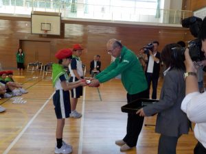 また、併せて、緑の募金を活用した(公社)国土緑化推進機構の事業により整備した花壇などの緑化事業の完成式も行われ、全労済富山支部中村博明本部長から少年団の活動ユニフォームである帽子やスカーフが贈られました。